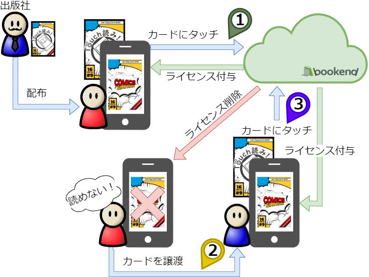 同じ媒体で他者がコンテンツをダウンロードした場合、元の所有者からはライセンスを削除することで「物理的なカードを他者に譲渡すると、デジタルの閲覧権もあわせて移譲される」という、いままで電子書籍ではなかった「ライセンスの譲渡」を実現しています。
